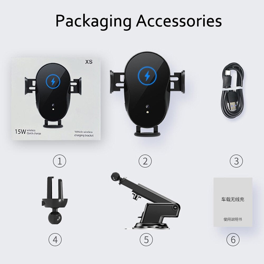 Chargeur de voiture sans fil Qi 15W, charge rapide, capteur intelligent, support de téléphone pour iPhone xs, serrage automatique.