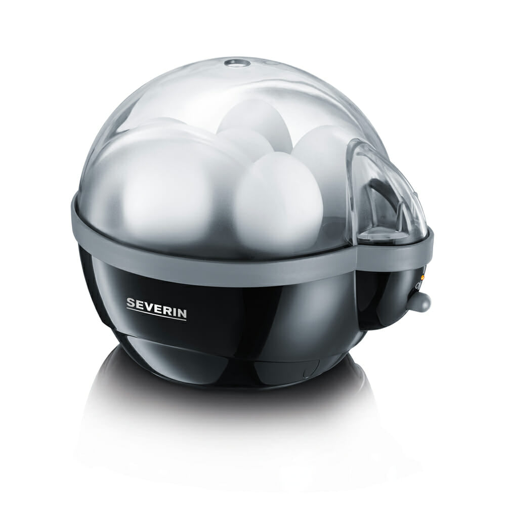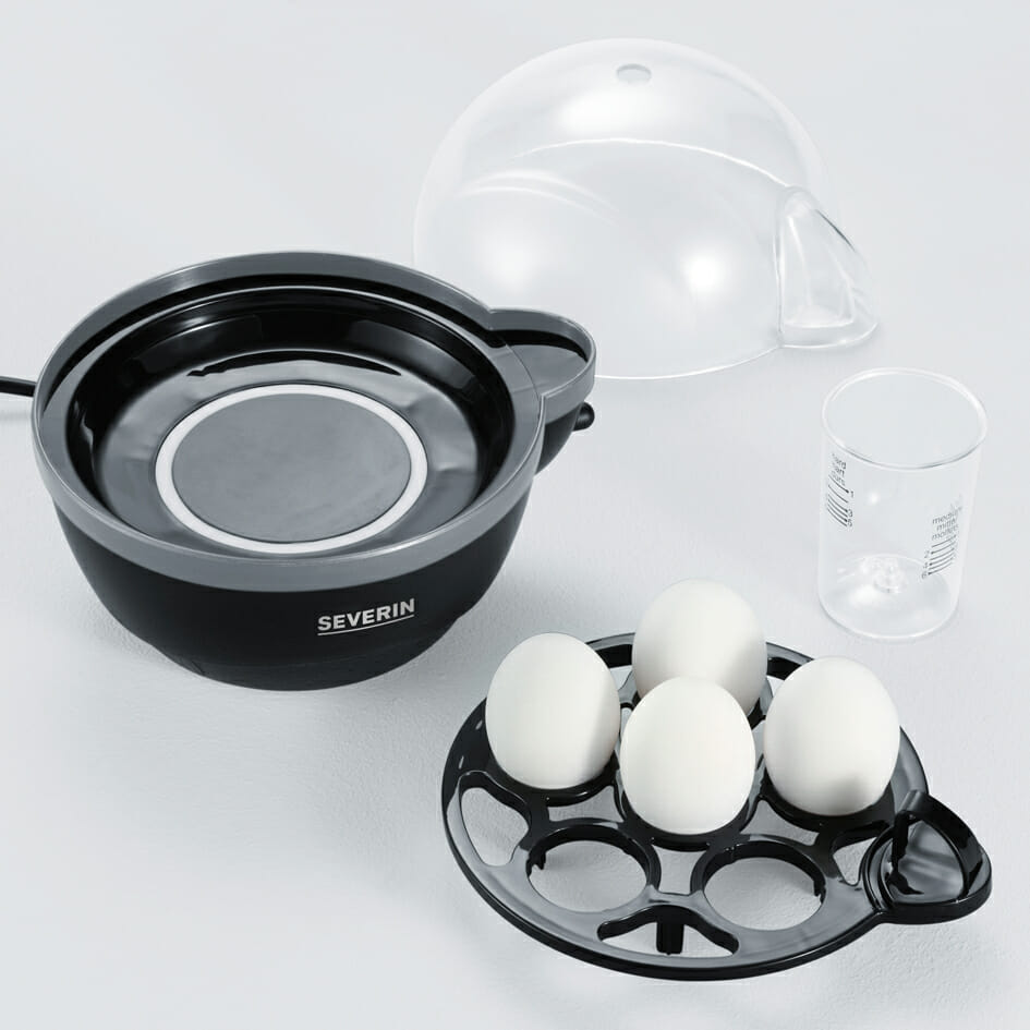 Coque, mollet ou plutôt dur ? Vous pouvez préparer jusqu’à six œufs à votre goût dans ce cuiseur à œufs. Le signal sonore en fin de cuisson, le gobelet doseur et le pique-œuf, ainsi que le témoin lumineux LED sur l’interrupteur marche/arrêt, sont des outils pratiques.