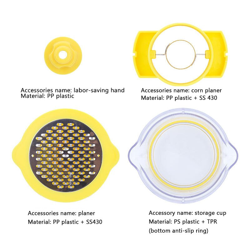 5) matériel et service Premium:L'outil d'épluchage de maïs d'acier inoxydable est fait du matériel en plastique transparent de PS de tasse de 500ml et du matériel en plastique jaune de PP, Le rabot est fait de rabot de maïs de qualité alimentaire 304 et de broyeur 430. L'éplucheur de maïs est une bonne aide pour la cuisine. Si quelque chose ne va pas avec le produit ou vous avez des questions, n'hésitez pas à nous contacter, nous vous répondrons dans les 12 heures et ferons de notre mieux pour résoudre vos problèmes rapidement.