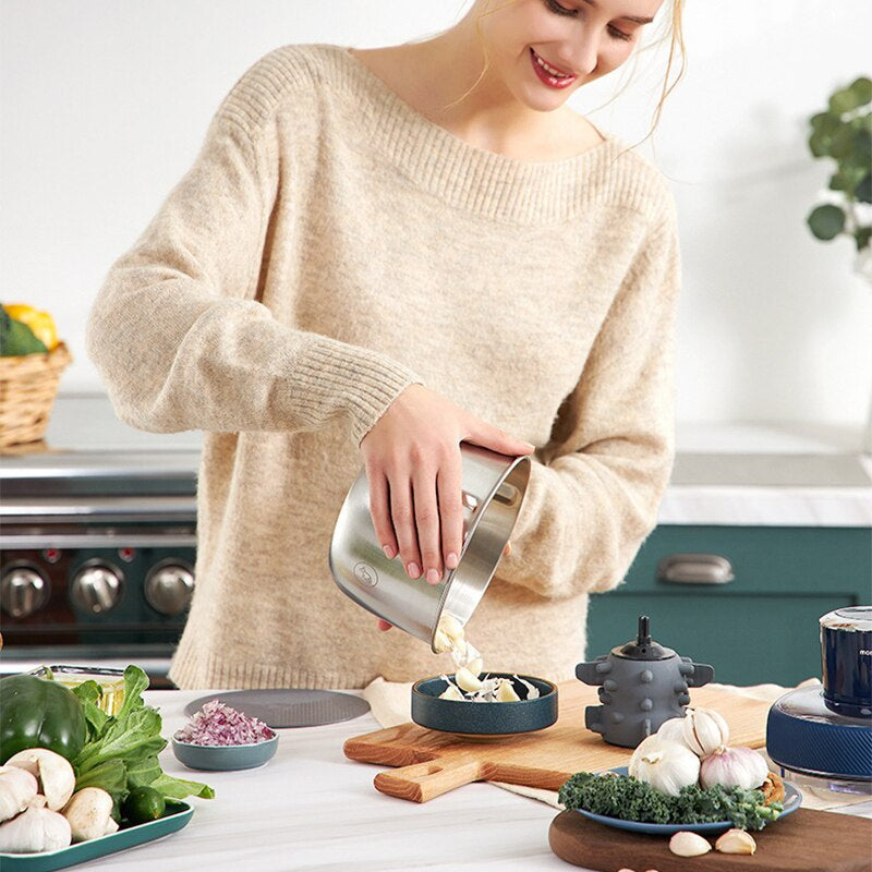 • Broyer rapidement la viande ou les légumes, qui peuvent être utilisés pour faire des garnitures ou des assaisonnements, des compléments alimentaires pour bébés, etc., peut être pressé pour ajuster l'épaisseur des ingrédients, équipé d'un éplucheur, peut rapidement peler l'ail;