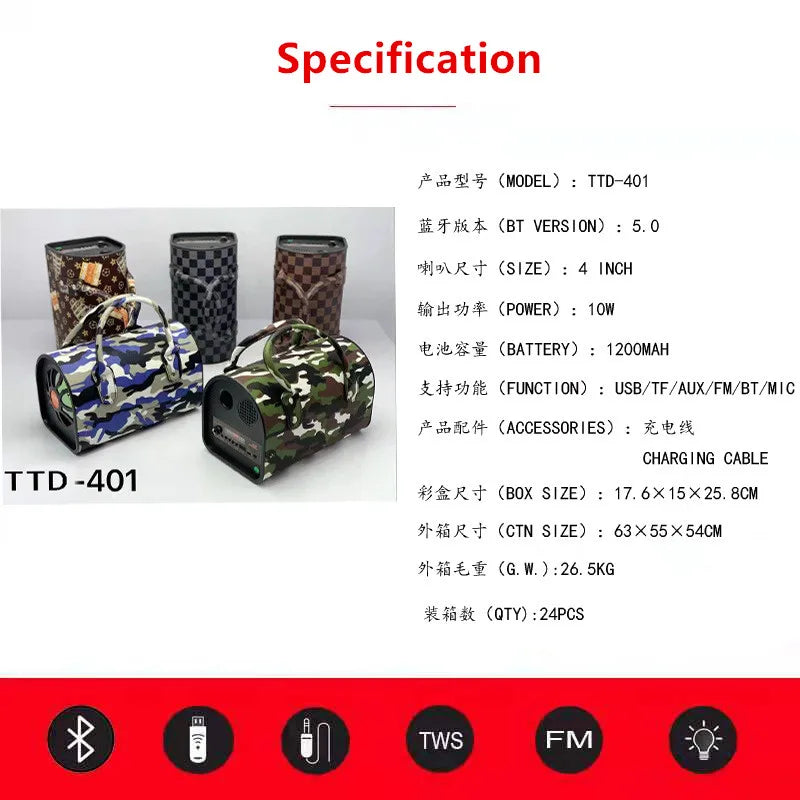 Ce haut-parleur Bluetooth sans fil TD-401 de 4 pouces est un choix puissant pour écouter de la musique en déplacement. Avec une puissance de 10W, il offre un son stéréo fort et clair, parfait pour les soirées karaoké. La fonction RGB ajoute une touche de couleur et de style à votre sac à main tout en offrant une expérience auditive haute qualité.